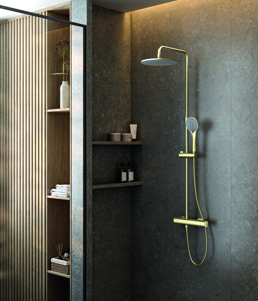 En el apartado de grifería, una de las principales incorporaciones es la columna de ducha serie KLOE, un conjunto monomando extensible disponible en acabados negro, cromado, brushed PVD Gold y brushed metal, pensado para adaptarse a diferentes estilos de baño.